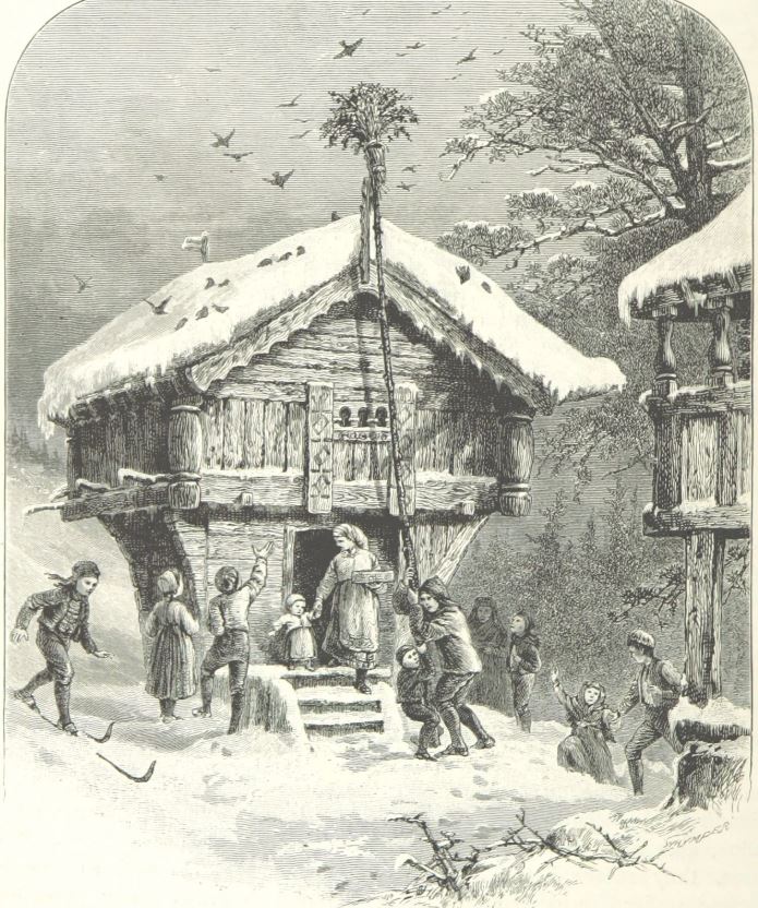Celebrating Yule-Tide, pen-and-pencil drawing by Richard Lovett in Norwegian Pictures (1885), based on the 1846 oil-on-canvas painting Juleskikk by Adolph Tidemand.